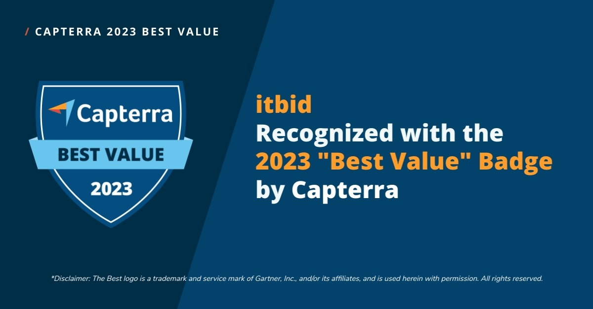 ¡Tenemos una gran noticia para compartir contigo! En itbid, nos enorgullece anunciar que hemos sido galardonados con la insignia «Best Value» en el directorio de software de Capterra de Gartner Digital Markets. Este reconocimiento es un testimonio del compromiso de itbid para brindar soluciones de alto valor a nuestros usuarios en la gestión de negocios y compras.