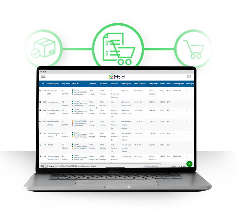 - Vincula las Órdenes de Compra a toda la información relacionada con el proveedor y los productos solicitados, incluyendo negociaciones y contratos, o a través de catálogos externos mediante tecnología Punchout.