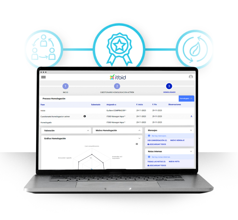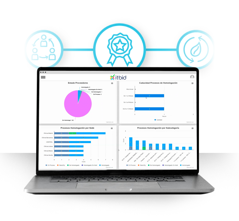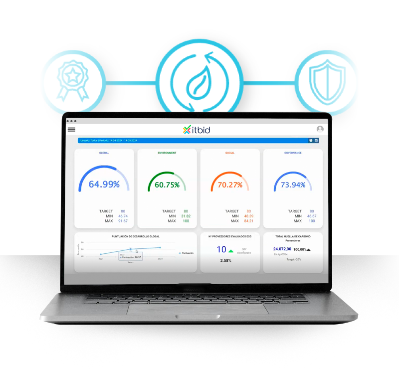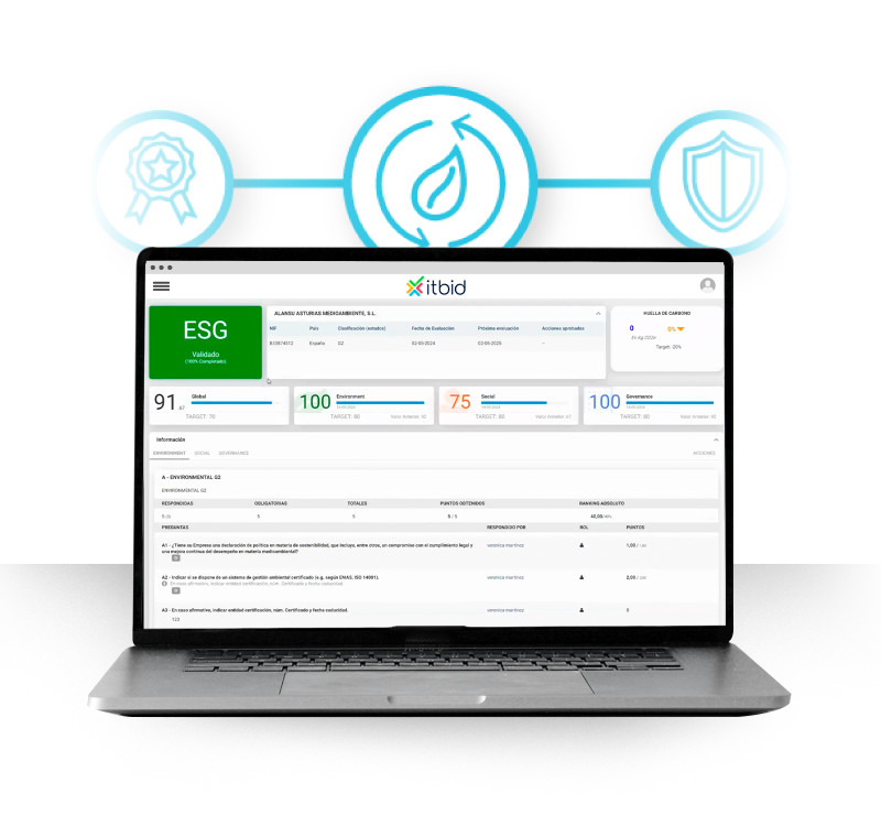 - Gestiona el ESG con la Metodología itbid de Compras Sostenibles con integración de sistemas, controlando tanto a proveedores evaluados internamente como por fuentes externas.